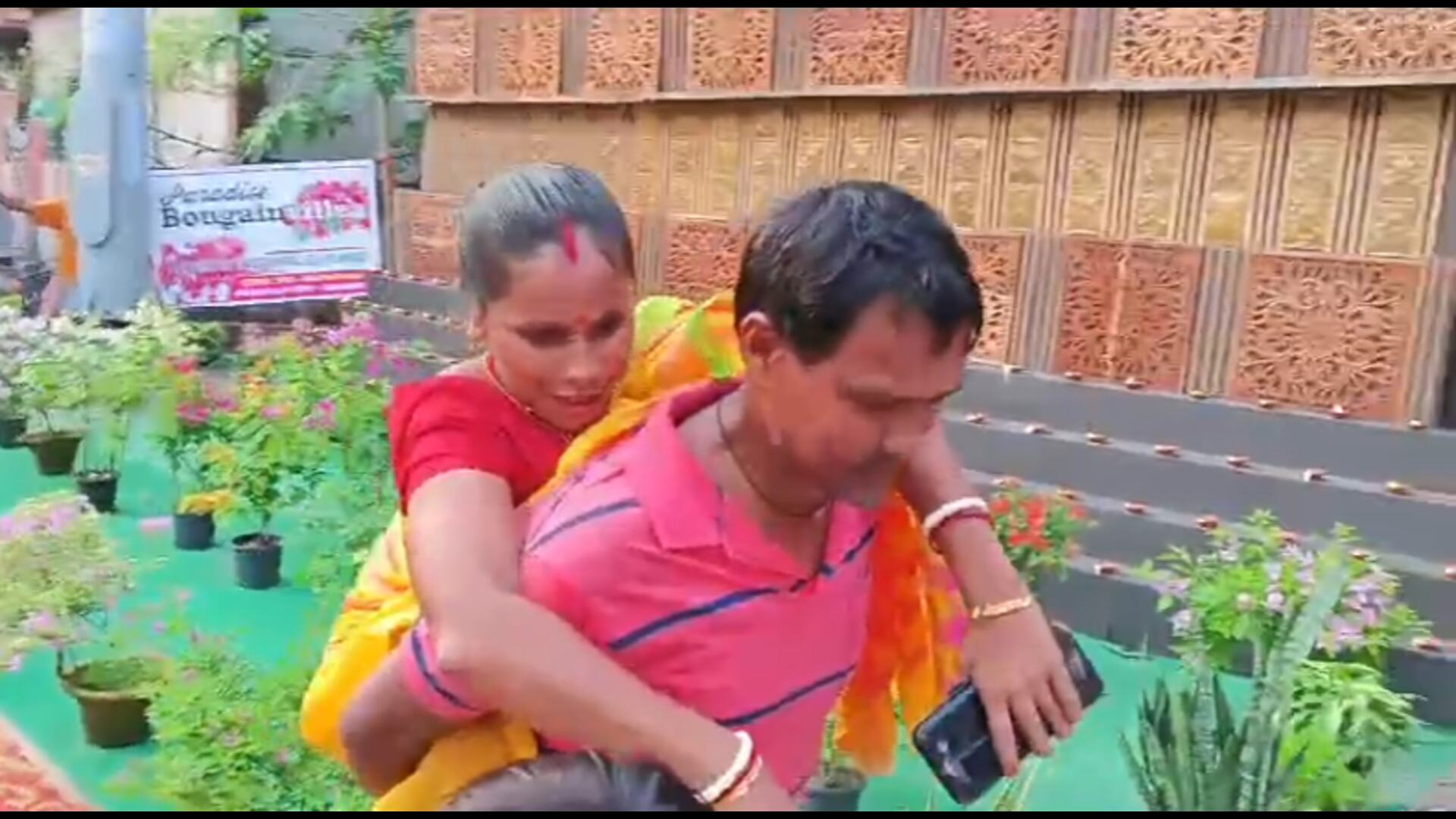 পঙ্গু স্ত্রীকে পিঠে করে নিয়ে ঠাকুর দেখাচ্ছেন স্বামী...