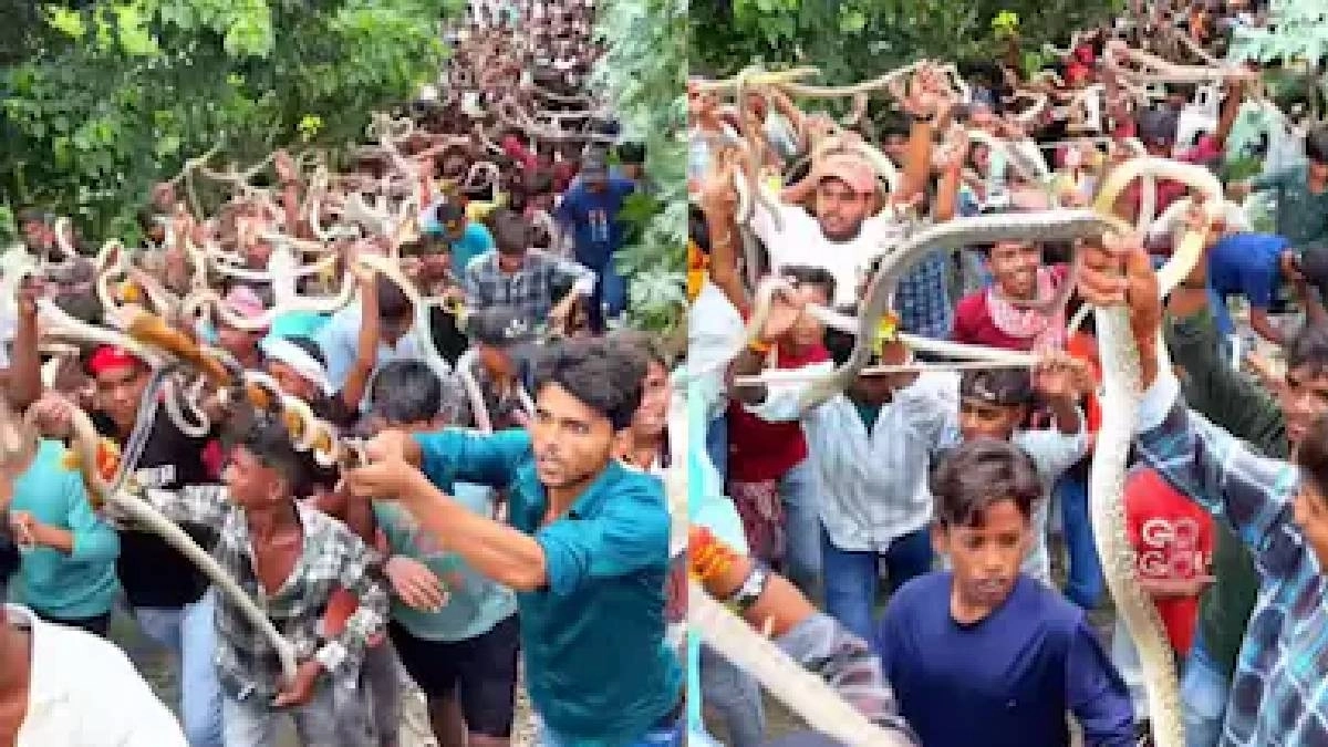 সর্বনাশ, এ কী দৃশ্য! গলায় পেঁচানো জ্যান্ত গোখরো, হাতের লাঠিতে কিলবিল করছে সাপ! নাগপঞ্চমীর 'রোমহর্ষক' প্রথা ঘির...