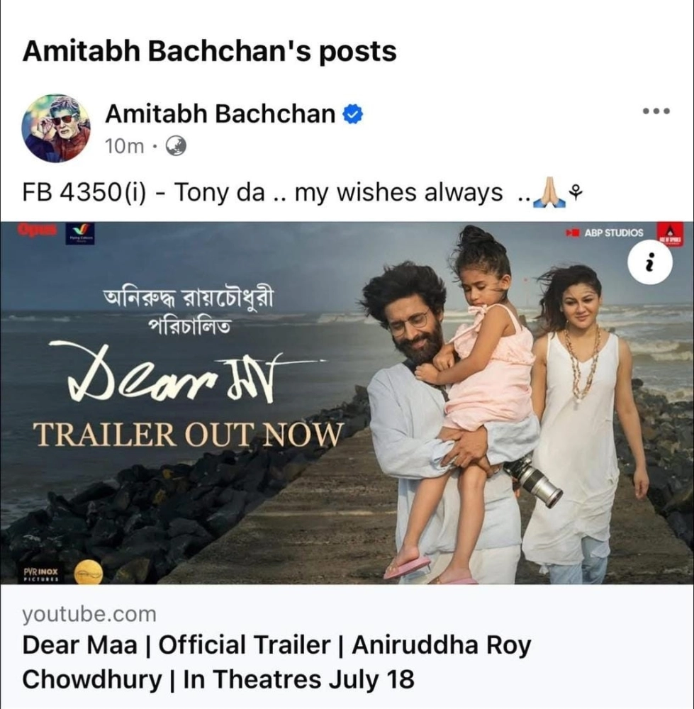 নিজস্ব সংবাদদাতা: কলকাতা থেকে নেটপাড়া এইমুহূর্তে সরগরম পরিচালক অনিরুদ্ধ রায়চৌধুরীর নতুন ছবি 'ডিয়ার মা'কে কেন্দ্র করে। দীর্ঘ ১০ বছর পর ফের বাংলা ছবি তৈরি করছেন অনিরুদ্ধ রায়চৌধুরী। ১৮ জুলাই মুক্তি পাচ্ছে অনিরুদ্ধ রায়চৌধুরী পরিচালিত ছবি ‘ডিয়ার মা’। অনু পরিবারের দাম্পত্য, মা-বাবার সঙ্গে সন্তানের সম্পর্ক এবং তাকে ঘিরে আরও অন্যান্য সম্পর্কের আবর্তন ধরা পড়বে ছবিতে। ছবিতে মুখ্য চরিত্রে আছেন জয়া আহসান, চন্দন রায় স্যান্যাল, শাশ্বত চট্টোপাধ্যায় এবং ধৃতিমান চট্টোপাধ্যায়। এবার এই ছবি ঘিরে জনমানসে আগ্রহ এক লাফে বাড়িয়ে দিলেন খোদ অমিতাভ বচ্চন!