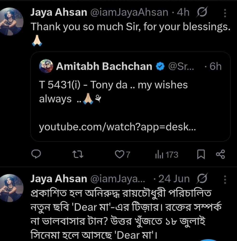 অমিতাভের সেই পোস্ট নিজের এক্স হ্যান্ডেলে শেয়ার করে জয়া লিখেছেন, “আশীর্বাদ করার জন্য অনেক ধন্যবাদ, স্যার। অনিরুদ্ধ রায়চৌধুরী-ও নিজের ইনস্টাগ্রাম স্টোরিতে অমিতাভের সেই পোস্ট শেয়ার করে প্রণাম ও ধন্যবাদ জানিয়েছেন। বাদ যাননি চন্দন রায় সান্যাল-ও। তিনিও নিজের ইনস্টাগ্রামে অমিতাভের সেই শুভেচ্ছাবার্তা শেয়ার করার পাশাপাশি তার সঙ্গে জুড়ে দিয়েছেন অমিতাভ অভিনীত এক জনপ্রিয় ছবির ততোধিক জনপ্রিয় গান।