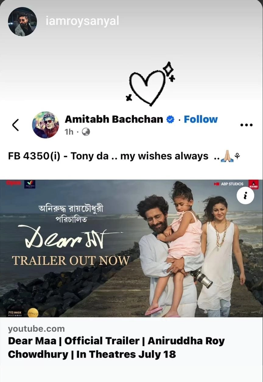 অনিরুদ্ধ রায় চৌধুরীর সঙ্গে ‘পিঙ্ক’ ছবিতে কাজ করেছেন অমিতাভ বচ্চন। একাধিকবার এই বাঙালি পরিচালকের কাজ নিয়ে প্রশংসা শোনা গিয়েছে ‘শাহেনশাহ’র মুখে। এবার অনিরুদ্ধের এই নতুন বাংলা ছবির ঝলক দেখে এক্স হ্যান্ডেলে অমিতাভ লেখেন, ‘‘টোনিদা, আপনার ছবির জন্য আমার শুভেচ্ছা সব সময় রয়েছে।’’ খোদ শাহেনশাহ র থেকে এহেন শুভেচ্ছা পেয়ে আপ্লুত ডিয়ার মা-র গোটা টিম।
