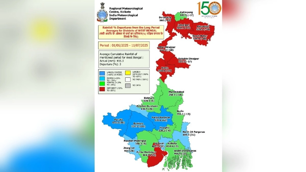 ১ জুলাই থেকে ১০ জুলাই, রাজ্যের কোথায় কতটা বৃষ্টি হয়েছে, তার হিসেব দিয়েছে আলিপু আবহাওয়া দপ্তর। তাতে বলা হয়েছে জুন এবং জুলাইয়ের প্রথম এগারো দিনে রাজ্যের এই আট জেলায় পর্যাপ্ত বৃষ্টি হয়নি। সেই আট জেলা হল- দার্জিলিং, জলপাইগুড়ি, আলিপুরদুয়ার, কোচবিহার, উত্তর দিনাজপুর, দক্ষিণ দিনাজপমালদহ, পূর্ব মেদিনীপুর।