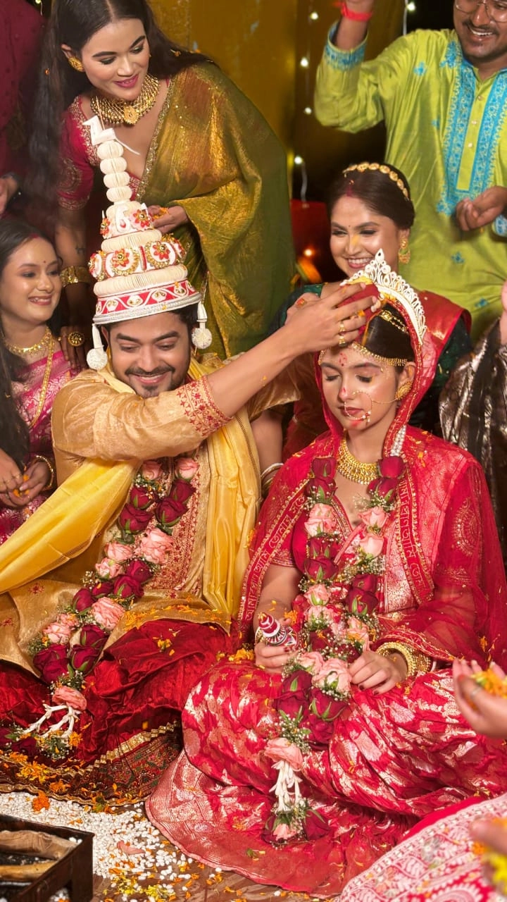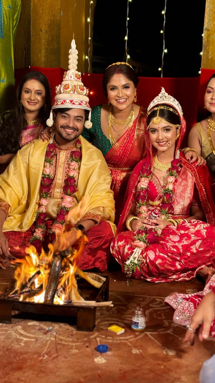 গায়ে হলুদের ছবি প্রকাশ্যে আসতেই নেটপাড়ায় হইচই শুরু। প্রশ্ন উঠছে তবে কি সত্যিই বিয়ে করলেন দুই তারকা? এর মাঝেই সামনে এল বিয়ের ছাদনাতলা থেকে সাতপাকে ঘোরার ছবিও। সামনে এল সিঁদুর দানের মুহূর্তও। অয়ন্যাকে দেখা গেল লাল বেনারসি, সঙ্গে সোনার গয়না, মাথায় টোপর। বর ও কনেকে মানিয়েছেও বেশ। এবার আরও জোরালো হয়েছে প্রশ্ন, এই বিয়ে কি আসল? নাকি কোনও শুটেরই অংশ?