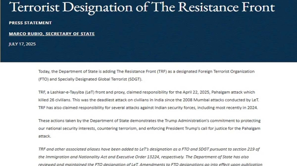 বৃহস্পতিবার প্রকাশিত এক বিবৃতিতে, মার্কিন বিদেশ সচিব মার্কো রুবিও বলেছেন, "আজ, মার্কিন বিদেশ মন্ত্রক দ্য রেজিস্ট্যান্স ফ্রন্ট (টিআরএফ)-কে বেদিশি সন্ত্রাসবাদী সংগঠন (এফটিও) এবং বিশেষভাবে মনোনীত বিশ্বব্যাপী সন্ত্রাসবাদী সংগঠন (এসডিজিটি) হিসাবে তালিকাভুক্ত করছে।"
