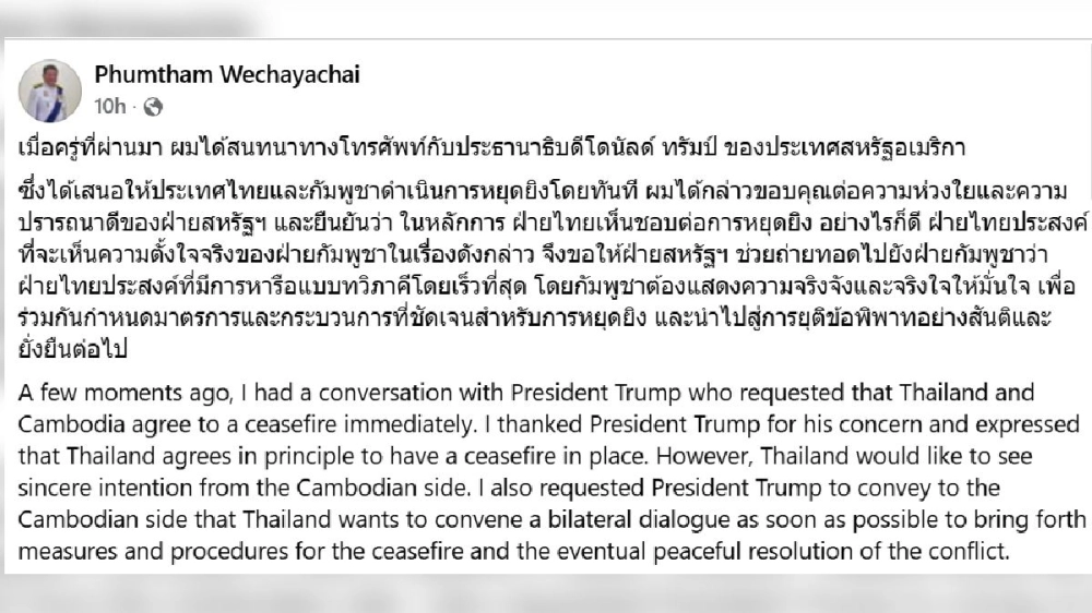 একইসঙ্গে তিনি পোস্টে লিখেছেন, ‘তবে, থাইল্যান্ড কম্বোডিয়ার পক্ষ থেকে আন্তরিক ইচ্ছা দেখতে চায়। আমি রাষ্ট্রপতি ট্রাম্পকে অনুরোধ করেছি যে তিনি কম্বোডিয়ার পক্ষকে জানান যে থাইল্যান্ড যত তাড়াতাড়ি সম্ভব একটি দ্বিপাক্ষিক সংলাপ আয়োজন করতে চায় যাতে যুদ্ধবিরতি এবং সংঘাতের শান্তিপূর্ণ সমাধানের জন্য ব্যবস্থা এবং পদ্ধতি বের করা যায়।‘
