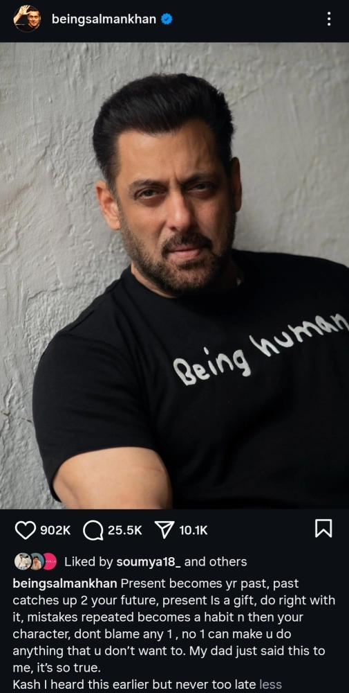 ওই পোস্টে সলমন লেখেন, 'বর্তমান একসময় তোমার অতীত হয়ে ওঠে, অতীত তোমার ভবিষ্যতের সঙ্গে মিশে যায়। বর্তমান একটি উপহার, এটি দিয়ে সঠিকভাবে কাজ করো, বারবার ভুল করা অভ্যাসে পরিণত হয়। তোমার চরিত্রের ঠিক-ভুলের জন্য কাউকে দোষ দিও না, কেউ তোমাকে এমন কিছু করতে বাধ্য করতে পারবে না যা তুমি করতে চাও না।'