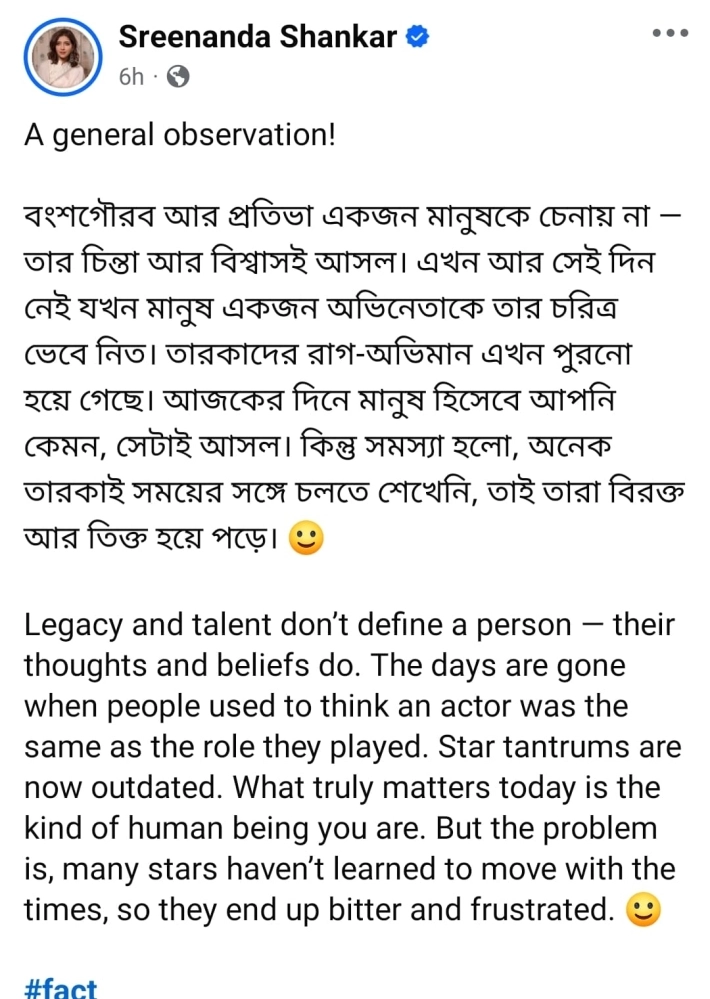 এবার মমতা শঙ্করের ভাইঝি তথা নৃত্যশিল্পী শ্রীনন্দা শঙ্কর নিজের সোশ্যাল মিডিয়ায় একটি পোস্ট করেছেন। যা নিয়ে ফের শোরগোল নেটপাড়ায়। সরাসরি কারও নাম না করলেও অনেকেই মনে করছেন তাঁর পোস্টের কেন্দ্রে পিসি মমতা-ই। শ্রীনন্দা লিখেছেন, ‘বংশগৌরব আর প্রতিভা একজন মানুষকে চেনায় না। তাঁর চিন্তা আর বিশ্বাসই আসল। এখন আর সেই দিন নেই যখন মানুষ একজন অভিনেতাকে তাঁর চরিত্র ভেবে নিত। তারকাদের রাগ-অভিমান এখন পুরনো হয়ে গেছে। আজকের দিনে মানুষ হিসেবে আপনি কেমন, সেটাই আসল। কিন্তু সমস্যা হল, অনেক তারকাই সময়ের সঙ্গে চলতে শেখেনি, তাই তাঁর বিরক্ত আর তিক্ত হয়ে পড়ে।’