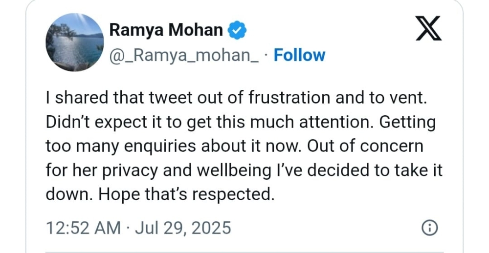 রাম্যা লিখেছিলেন, “দক্ষিণে মাদক সেবন এবং কাস্টিং কাউচ খুব একটা বড় ব্যাপার নয়। একটি মেয়েকে আমি চিনি তাঁর এমন পরিণতি হয়েছে যা চোখে দেখা যায় না। যৌন হেনস্থা থেকে টাকা পয়সার তছরুপ— সব ধরনের নেতিবাচক কাজের সঙ্গে যুক্ত অভিনেতা।” এই পোস্টটি পরে কেন মুছে দেন রাম্যা? তিনি জানিয়েছেন, নিজের মাথা ঠিক রাখতে না পেরে সবটা উগরে দিয়েছেন। কিন্তু পরে তিনি বুঝতে পারেন যে মেয়েটির ঘটনা বর্ণনা করেছেন তাঁর কোনও সমস্যা হতে পারে। সেই মেয়েটির নিরাপত্তার কথা ভেবে নিজের টুইট মুছে দেন রাম্যা।