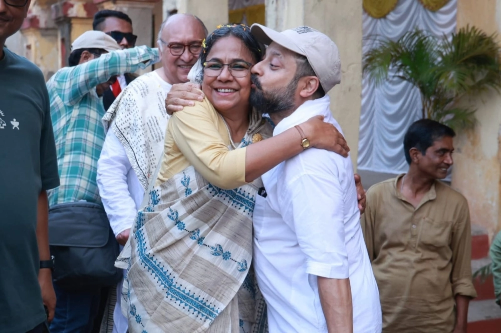 পরের ছবিতে পাল্টা ভালোবাসা ফিরিয়ে দিচ্ছেন শিবু—এবার তিনিই সীমা বিশ্বাসকে জড়িয়ে ধরে গালে চুমু দিচ্ছেন। ফ্রেমে তখনও একই উজ্জ্বলতা, একই আবেগ, একই শ্রদ্ধার ছোঁয়া।পিছনে দাঁড়িয়ে থাকা ভিক্টর ব্যানার্জির মুখের হাসি তখনও অম্লান।