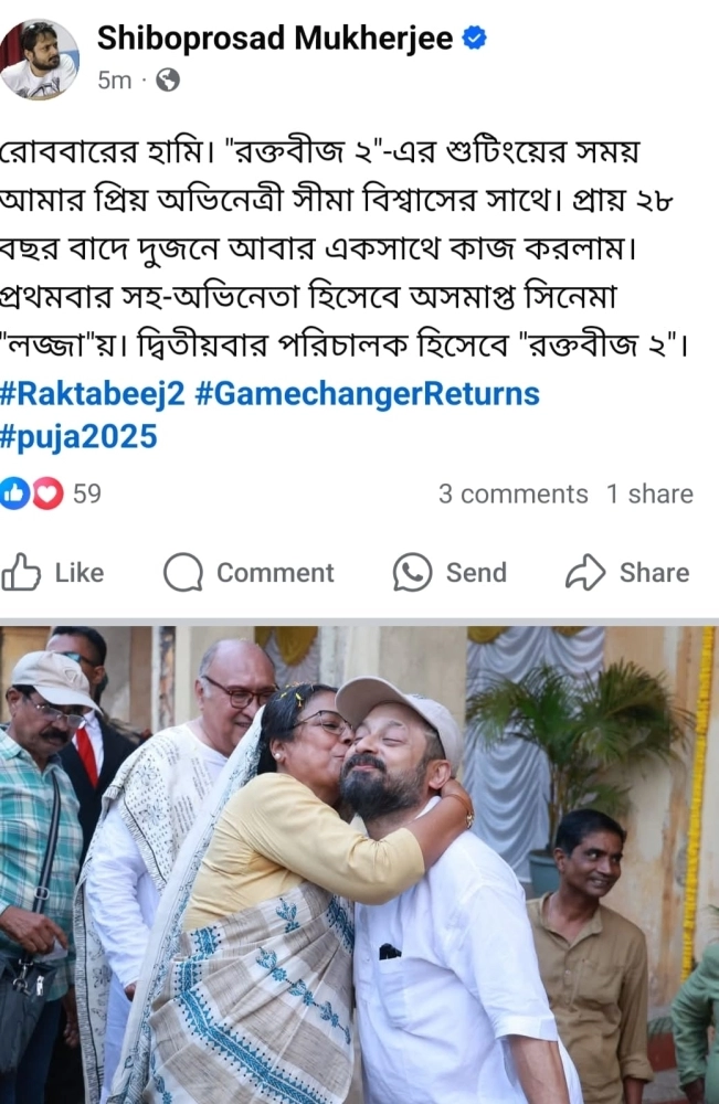 “রোববারের হামি। ‘রক্তবীজ ২’-এর শুটিংয়ের সময় আমার প্রিয় অভিনেত্রী সীমা বিশ্বাসের সাথে। প্রায় ২৮ বছর বাদে দুজনে আবার একসাথে কাজ করলাম। প্রথমবার সহ-অভিনেতা হিসেবে অসমাপ্ত সিনেমা "লজ্জা"য়। দ্বিতীয়বার পরিচালক হিসেবে ‘রক্তবীজ ২’। ”