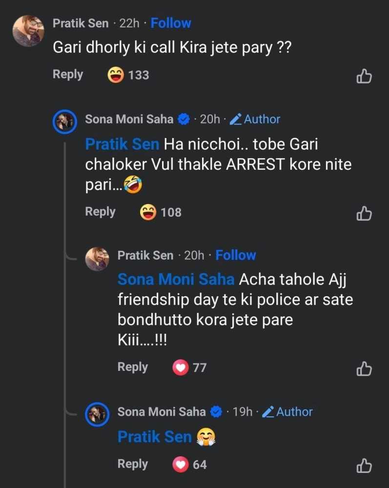 সমাজমাধ্যমে নিজের নতুন লুকের ছবিগুলো ভাগ করেছেন সোনামণি। রবিবার বিশ্ব বন্ধুত্ব দিবসে আরও এক চমক এল অনুরাগীদের জন্য। আরও একবার স্পষ্ট হল প্রতীক সেনের সঙ্গে নায়িকার অটুট 'বন্ধুত্ব'-এর কথা। সোনামণিকে নতুন লুকে দেখে অবাক প্রতীকও। তিনি মন্তব্য করেছেন 'গাড়ি ধরলে কি কল করা যেতে পারে?' সোনামণিও কম যান না, তিনি প্রতীকের মন্তব্যের জবাবে লেখেন, 'হ্যাঁ নিশ্চয়ই, তবে গাড়ি চালকের ভুল থাকলে অ্যারেস্ট করে নিতে পারি।' পাল্টা প্রতীক লেখেন, 'আচ্ছা, তাহলে আজ ফ্রেন্ডশিপ ডেতে কি পুলিশের সঙ্গে বন্ধুত্ব করা যেতে পারে!' এর উত্তরে আহ্লাদে আটখানা হওয়ার এক ইমোজি দেন সোনামণি।