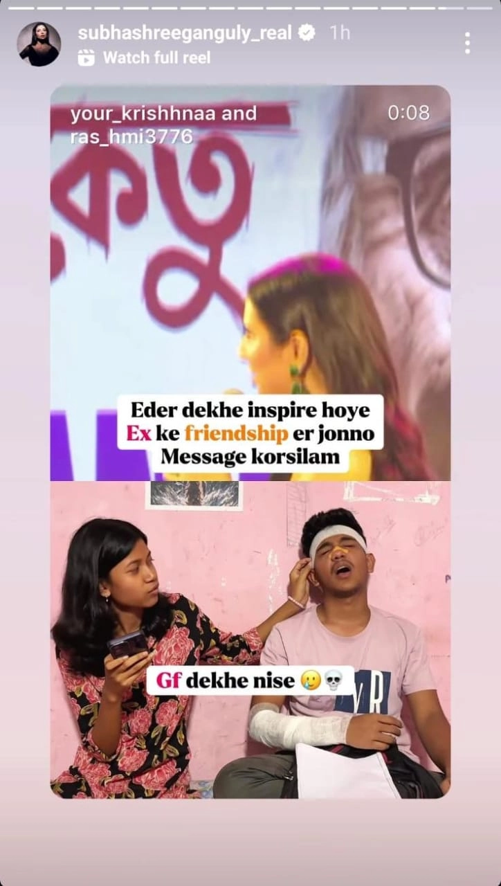 নিজের ইনস্টাগ্রাম স্টোরিতে একটি মিম শেয়ার করেছেন শুভশ্রী। কী আছে সেটিতে? পুরো মিমটি দু'ভাগে বিভক্ত। উপরের দিকে রয়েছেন দেব-শুভশ্রী। সেখানে লেখা, 'এঁদের দেখে বন্ধুত্ব করার জন্য এক্সকে মেসেজ করেছিলাম'। মিমটির নিচের দিকে দেখা যাচ্ছে, মাথায় ব্যান্ডেজ বেঁধে বেদনায় কাতর এক যুবককে। পাশে বসে তাঁর প্রেমিকা। সেই ছবির সঙ্গে লেখা, 'প্রেমিকা দেখে ফেলেছে'। অর্থাৎ মিমের ভাবার্থ এই যে, দেব-শুভশ্রী দ্বারা অনুপ্রাণিত হয়ে প্রাক্তনকে বন্ধুত্বের বার্তা দেওয়ার পরেই রাগে সেই যুবকের এমন করুণ পরিণতি। নেপথ্যে তারই প্রেমিকা।