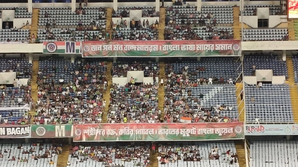 বাংলা মায়ের ভাষা। বাংলা রবিঠাকুরের ভাষা। বাংলা বঙ্কিমচন্দ্রের ভাষা। তাঁরা এই ভাষাকে গড়েছেন। এই ভাষাকে পৌঁছে দিয়েছেন বিশ্বের দরবারে। সেই ভাষারই নাকি অস্তিত্ব নেই। হাস্যকর এই মন্তব্যের প্রতিবাদ ঢেউয়ের মতো আছড়ে পড়েছে কংক্রিটের গ্যালারিতে। শনিসন্ধ্যার যুবভারতীতে ওই ব্যানারে একই সঙ্গে 'জন গণ মন ও বন্দেমাতরম'-এর সহাবস্থান। রবিঠাকুর ও বঙ্কিমের সৃষ্টি আমাদের রক্তের গতি তেজিয়ান করে তোলে। সবুজ-মেরুন গ্যালারিতে লেখা, ''শহীদের রক্ত, কবির নোবেল, ভারতের মুকুটে বাংলা জুয়েল।''