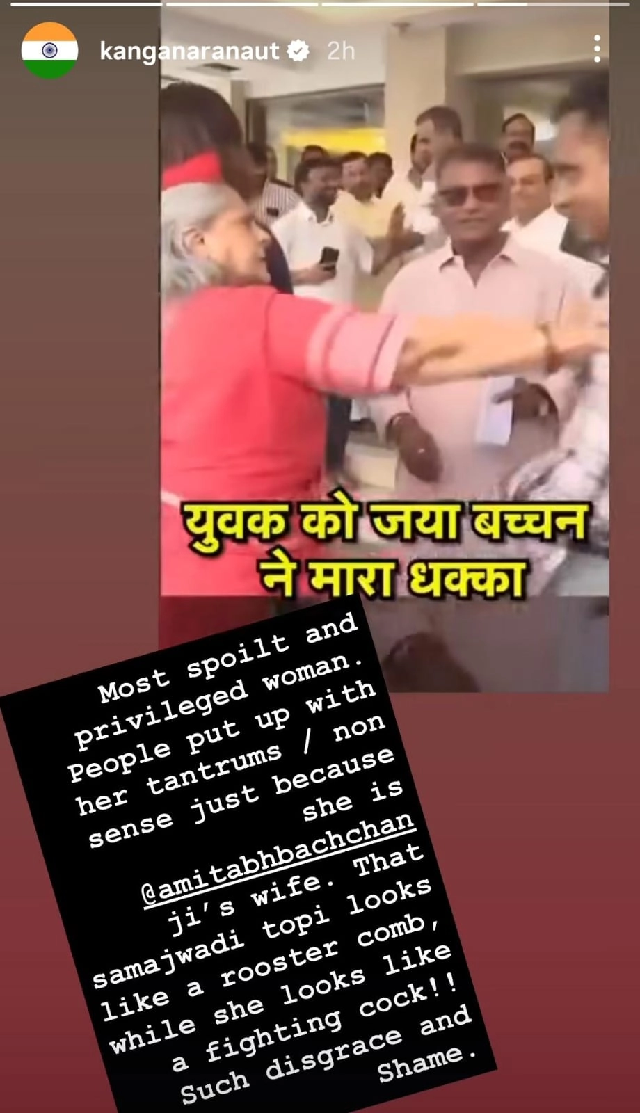 কঙ্গনার তোপ —“সবচেয়ে ফালতু আর বিশেষ সুবিধাভোগী মহিলা। শুধু উনি অমিতাভ বচ্চনজির স্ত্রী বলেই, লোকজন তাঁর নানান খেয়ালখুশির মতো আচরণ আর বাজে ব্যবহার সহ্য করে। ওঁর মাথায় পরা সমাজবাদী টুপি দেখতে একদম মোরগের ঝুঁটির মতো! আর তিনি যেন একেবারে ক্ষ্যাপা মোরগ! এ এক বিরাট লজ্জা আর কলঙ্ক।”