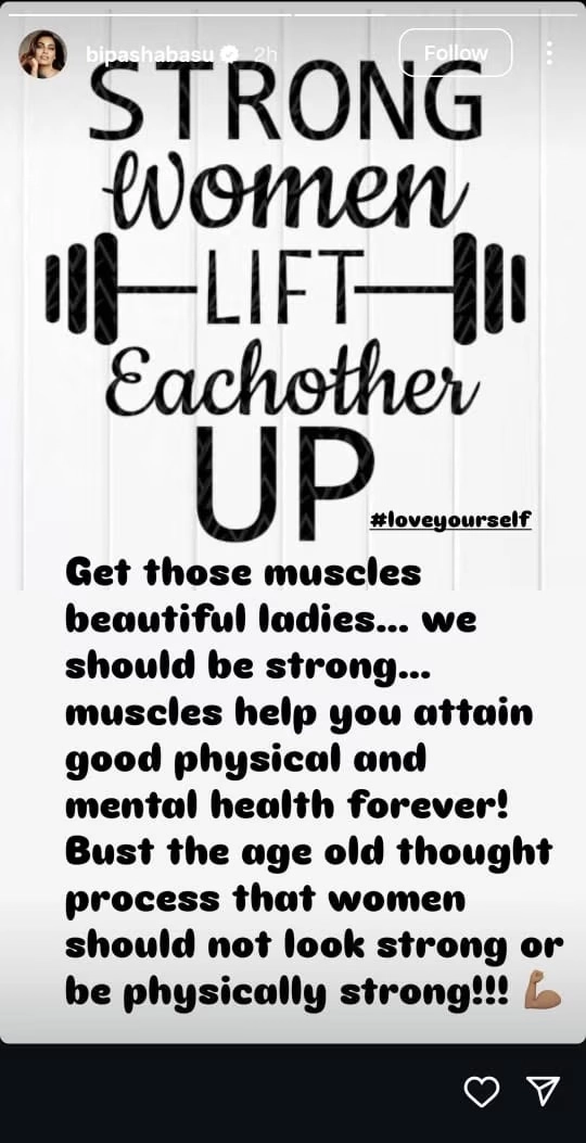বুধবার বিপাশা বসু নিজের ইনস্টাগ্রাম স্টোরিতে করলেন এক রহস্যময় পোস্ট—যেটা অনেকেরই মতে সরাসরি জবাব না হলেও তা হচ্ছে ম্রুণালের মন্তব্যের বিরুদ্ধে স্পষ্ট ও পাল্টা জবাব। বিপাশার স্টোরিতে লেখা ছিল—“শক্তিশালী নারীরা একে অন্যের হাত ধরে উন্নতিসাধন করে।” শুধু তাই নয়, ক্যাপশনে তিনি আরও যোগ করলেন—“সুন্দরী মহিলারা, পেশি গড়ো। আমাদের শক্তিশালী হওয়া উচিত। শারীরিক ও মানসিক সুস্থতার জন্য সুগঠিত পেশি থাকা অত্যন্ত জরুরি! তাই এই পুরনো ধারণা ভেঙে দাও যে, মেয়েরা শক্তিশালী বা অ্যাথলেটিক দেখাবে না।”