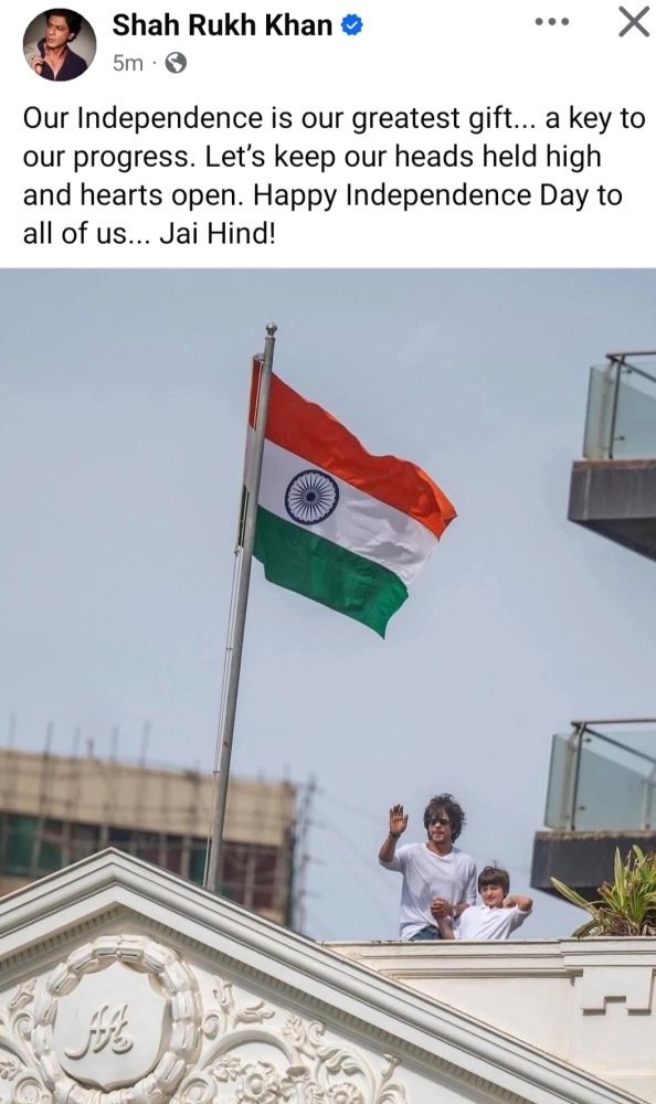 শাহরুখ খানের জন্য স্বাধীনতা দিবস কখনওই কেবল আনুষ্ঠানিক শুভেচ্ছা নয়, বরং হৃদয়ের কাছের এক আবেগ। ২০২৪ সালে তিনি তেরঙা হাতে নিজের ছবি পোস্ট করে লিখেছিলেন, “ আমাদের জাতীয় পতাকা যেন সবসময় উঁচুতে উড়তে থাকে এবং আমাদের অফুরান প্রেরণা জোগাতে থাকে দেশের জন্য আরও কিছু করতে পারার জন্য। জয় হিন্দ।”