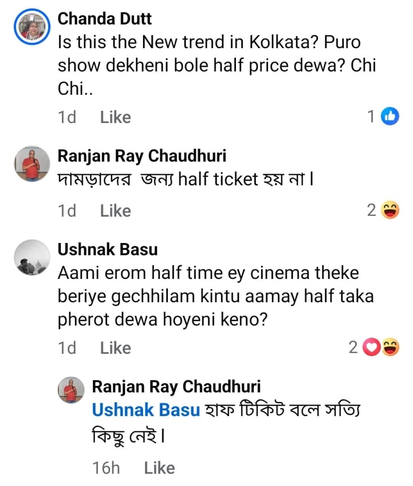কানাঘুষো, সেই পরিচালক একটা সময় নাকি অঞ্জনেরও কাছের মানুষ ছিলেন। তবে সেই তাল কেটেছে। স্বভাবতই ওই পরিচালকের এহেন কাণ্ডে মর্মাহত এবং ঈষৎ ক্ষুব্ধ অঞ্জন। তারই ফলাফল নাকি ফেসবুকে বেলা বসের প্রেমিক এর এই পোস্ট! অঞ্জন দত্ত যদিও পোস্টের বার্তা বাক্স অফ করে দিয়েছেন, তবু তার মধ্যেই বেশ কিছু ধারালো কমেন্ট এসে জড়ো হয়েছে সেই পোস্টে। একজন লিখেছেন, “এই ব্যাপারটা কি কলকাতার নতুন ট্রেন্ড? পুরো শো দেখেননি বলে অর্ধেক টাকা দেওয়া? ছি ছি।” নজর কেড়েছে আরও এক নেটপাড়ার সদস্যের বার্তা – “হাফ টিকিট বলে সত্যি কিছু নেই!”