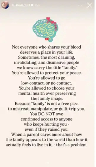 কী লিখলেন ত্রিশলা? স্টোরিতে ত্রিশালা লেখেন—“শরীরে এক রক্ত বইলেই যে, জীবনে তাঁকে স্থান দিতে হবে এমন কথা নেই… কখনও কখনও জীবনের সবচেয়ে ক্ষতিকর, অবহেলাকারী গুরুত্বহীন মানুষই আমাদের পরিবারের অংশ হয়। পরিবারের তকমা নিয়ে ঘুরে বেড়ায়। নিজের মানসিক শান্তি রক্ষা করার দায়িত্ব তোমার নিজের।মানসিক শান্তি রক্ষার জন্য তুমি চাইলে দূরে সরে যেতে পারো। কম যোগাযোগ বা একেবারেই যোগাযোগ না রাখার অধিকার তোমার আছে।”