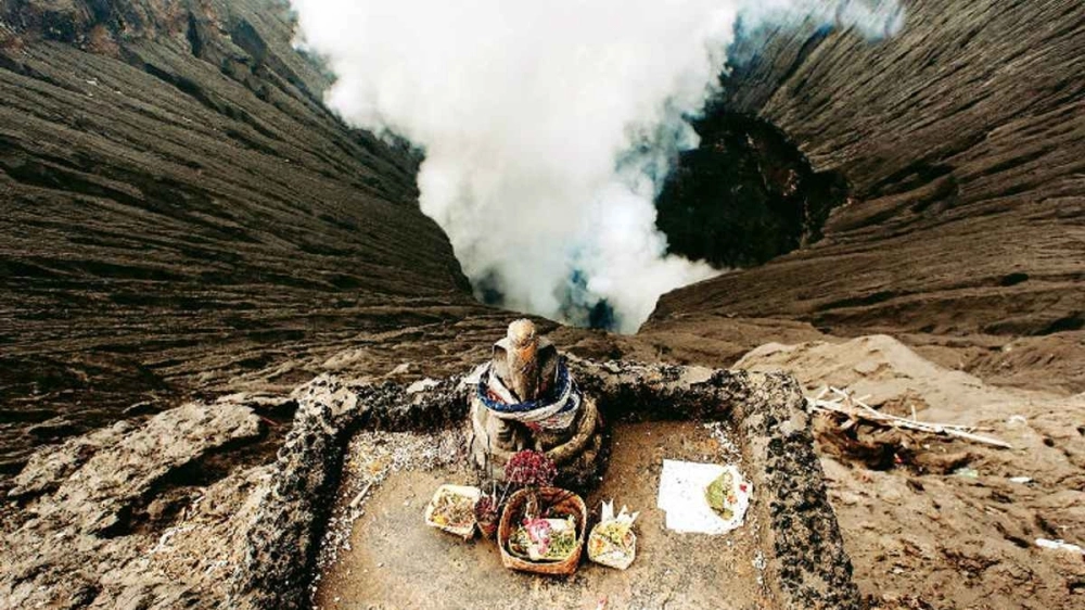 The 700 year old Ganesh idol at the edge of the active Mount Bromo (Brahma) in East Java, Indonesia. There are over 100 active volcanoes in this area & locals worship the Ganpati idol for protecting them for hundreds if not thousands of years. ❤️???? pic.twitter.com/mCXeH7BjWU