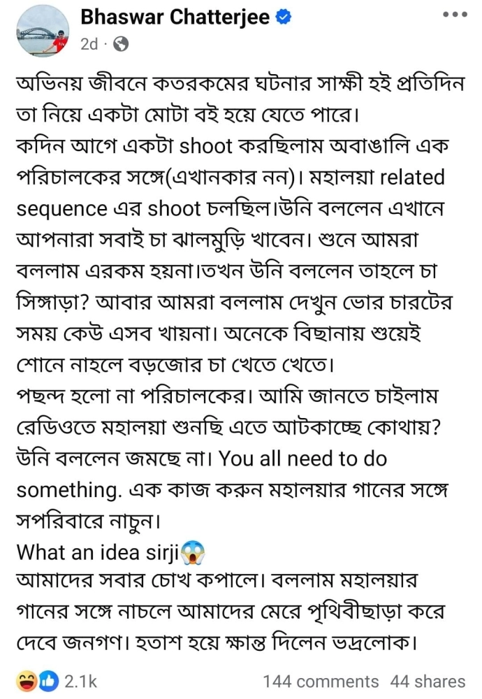 কদিন আগে একটা shoot করছিলাম অবাঙালি এক পরিচালকের সঙ্গে(এখানকার নন)। মহালয়া related sequence এর shoot চলছিল।উনি বললেন এখানে আপনারা সবাই চা ঝালমুড়ি খাবেন। শুনে আমরা বললাম এরকম হয়না।তখন উনি বললেন তাহলে চা সিঙ্গাড়া? আবার আমরা বললাম দেখুন ভোর চারটের সময় কেউ এসব খায়না। অনেকে বিছানায় শুয়েই শোনে নাহলে বড়জোর চা খেতে খেতে।
