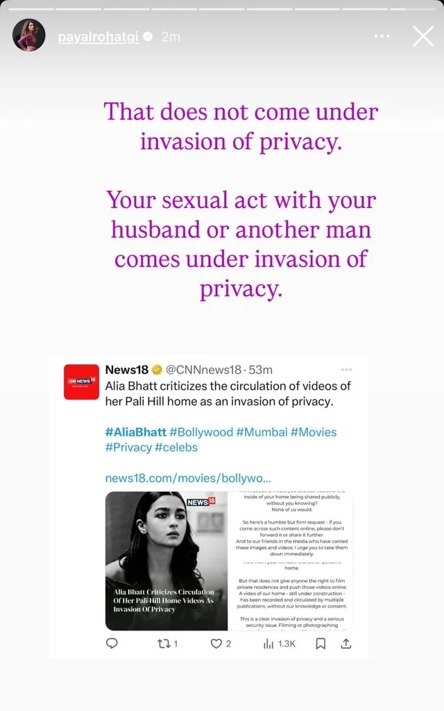 কিন্তু এরপরেই শুরু হয়েছে নাটক। অভিনেত্রী তথা ‘বিগ বস ‘২ প্রতিযোগী পায়েল রোহতগী আলিয়ার এই নোট রিশেয়ার করে চমকে দেওয়া মন্তব্য করেন। তাঁর কথায়— “এটা প্রাইভেসি ভায়োলেশন নয়। এটা গোপনীয়তার লঙ্ঘনের আওতায় আসে না। আপনার স্বামী বা অন্য কোনও পুরুষের সাথে আপনার যৌন সম্পর্ক গোপনীয়তার লঙ্ঘনের আওতায় আসে।”