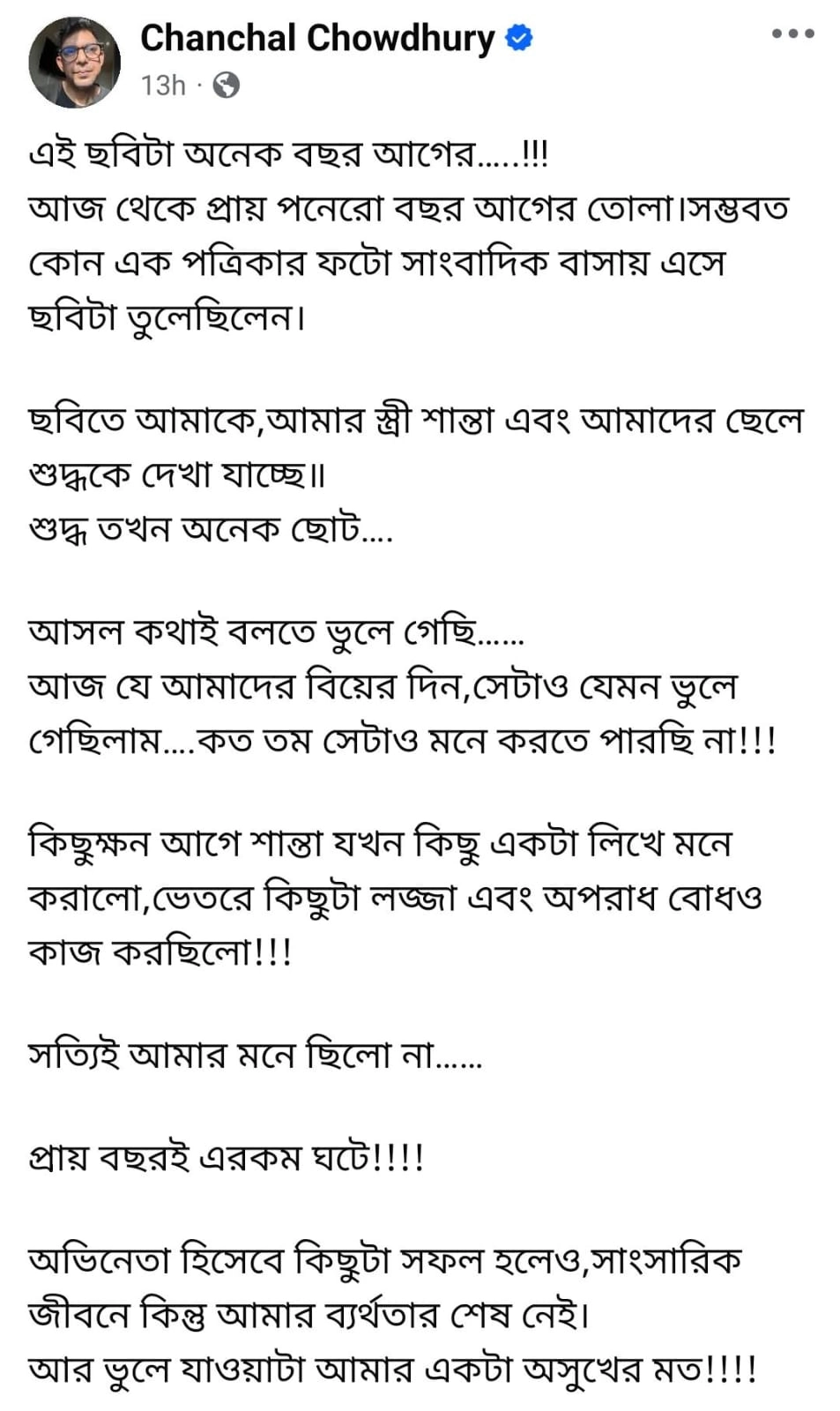 স্ত্রীর সঙ্গে নিজের বহু বছর আগের তোলা একটি ছবি পোস্ট করেছেন চঞ্চল। সেই ছবিতে দেখা যাচ্ছে তাঁদের সন্তান শুদ্ধ-কেও। যদিও শুদ্ধ তখন একরত্তি। সেই ফেসবুক পোস্টে চঞ্চল লিখলেন -