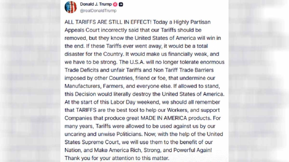 অন্যদিকে মার্কিন প্রেসিডেন্ট ডোনাল্ড ট্রাম্প যুক্তরাষ্ট্রের এই আপিল আদালতের রায়ের তীব্র সমালোচনা করেছেন। ওই রায়ে তাঁর বেশিরভাগ শুল্ক আরোপকে অবৈধ বলা হয়েছিল। ট্রাম্প এই সিদ্ধান্তকে “ভুল” আখ্যা দিয়ে জোর দিয়ে বলেছেন, শুল্ক কার্যকরই থাকবে। নিজের সামাজিক মাধ্যমে ট্রাম্প লেখেন, “সব শুল্ক এখনও কার্যকর আছে! আজ এক পক্ষপাতদুষ্ট আপিল আদালত ভুলভাবে বলেছে আমাদের শুল্ক তুলে নেওয়া উচিত, কিন্তু তারা জানে শেষ পর্যন্ত আমেরিকাই জিতবে। তিনি আরও বলেন, “যদি এই শুল্ক কখনও তুলে নেওয়া হয়, তবে তা দেশটির জন্য একেবারে বিপর্যয় ডেকে আনবে।এটি আমাদের আর্থিকভাবে দুর্বল করে দেবে, অথচ আমাদের শক্তিশালী থাকতে হবে।