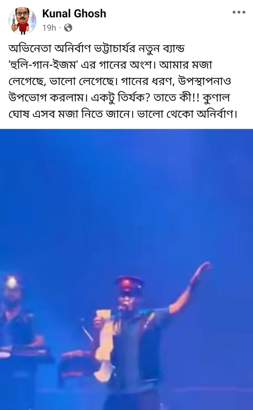 মঞ্চে পারফরম্যান্সের মাঝেই অনির্বাণ গেয়ে চলেন, “এসব গান বাজনা ছাড়, চল প্রোমোটারি করি, বড় গাড়ি চড়ি, ইলেকশনের মেজাজ বুঝে দলটা বদল করি!” এরপরই তৃণমূল নেতার নাম নিয়ে গানের সংলাপে অনির্বাণ বললেন, “ভাই, ভাই, এই আমাদের দোষ! গান-বাজনা করতে এসে এসব কথা বললে, রেগে যাবে, রেগে যাবে, রেগে যাবে কুণাল ঘোষ!…” শোনামাত্রই উল্লাসে ফেটে পড়ে উপস্থিত দর্শক। তবে এহেন রাজনৈতিক কটাক্ষ-সুগন্ধি মেশানো গানে মোটেই রাগ করেননি কুণাল ঘোষ। বরং সেই গানের ওই অংশটুকুর ভিডিও নিজের ফেসবুক অ্যাকাউন্ট থেকে শেয়ার করে অনির্বাণ ও তাঁর ব্যান্ডের একপ্রকার ঢালাও প্রশংসা করেছেন তৃণমূলের মুখপাত্র -“অভিনেতা অনির্বাণ ভট্টাচার্যর নতুন ব্যান্ড ‘হুলি-গান-ইজম’ এর গানের অংশ। আমার মজা লেগেছে, ভাল লেগেছে। গানের ধরণ, উপস্থাপনাও উপভোগ করলাম। একটু তির্যক? তাতে কী! কুণাল ঘোষ এসব মজা নিতে জানে। ভাল থেকো অনির্বাণ।”