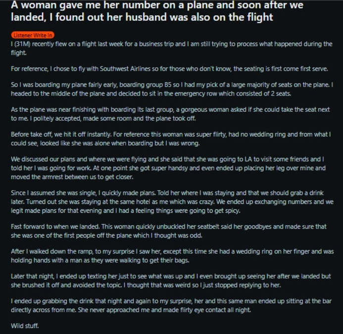 ব্যক্তিটি এমন একটি বিমান সংস্থার বিমানে চড়ে ব্যবসায়িক ভ্রমণে যাচ্ছিলেন যেখানে আগে থেকে আসন নির্বাচনের অনুমতি নেই। বোর্ডিং করার পর, বিমানের আসনে বসে ওই ব্যক্তি দেখেন তাঁর পাশের আসনেই যোগ দিয়েছেন একজন আকর্ষণীয় মহিলা। যিনি তাঁকে অবাক করে দিয়ে প্রকাশ্যে তাঁর সঙ্গে প্রকাশ্যে ফ্লার্ট করতে শুরু করেন।