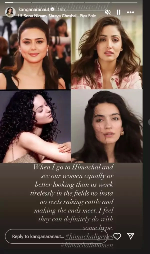 কিছুদিন আগে একাধিক জনপ্রিয় বলি-অভিনেত্রীদের প্রশংসা শোনা গিয়েছিল কঙ্গনা রানাউতের মুখে। সেই তালিকায় ছিলেন ইয়ামি গৌতমও। একইসঙ্গে নিজের জন্মস্থান হিমাচল প্রদেশের শ্রমজীবী মহিলাদের হয়ে জোর গলায় আওয়াজ তুলতেও দেখা গেল তাঁকে। সমাজমাধ্যমে নিজের অ্যাকাউন্ট থেকে একটি পোস্ট করেছেন কঙ্গনা। সেই পোস্টে রয়েছে তাঁর সঙ্গে প্রীতি জিন্টা, ইয়ামি গৌতম এবং ‘লাপতা লেডিজ’ ছবিখ্যাত অভিনেত্রী প্রতিভা রান্তা। এই চার অভিনেত্রীর জন্মস্থান হিমাচল প্রদেশ। সেকথা উল্লেখ করে কঙ্গনা ছবির ক্যাপশনে লিখেছেন, ‘হিমাচলের বাসিন্দারা’। তবে এই ক্যাপশন দিয়েই থেমে যাননি ‘ক্যুইন’। গলা ছড়িয়েছেন হিমাচল প্রদেশের শ্রমজীবী নারীদের হয়েও, যাঁরা প্রচার ও ক্যামেরার আড়ালে নিজেদের কাজ করে চলেছেন প্রতিদিন, প্রতিনিয়ত।