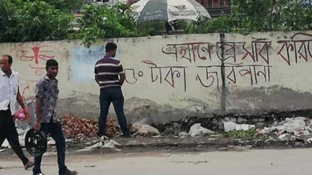 শহরের দেওয়ালে দেওয়ালে লেখা রয়েছে, ‘এখানে প্রস্রাব করিবেন না। করিলে ৫০ টাকা জরিমানা।’ কোথাও লেখা, ২০০ টাকা, কোথাও ১৫০০ টাকা। কোথাও আবার বিশাল কাঁচির চিহ্ন।