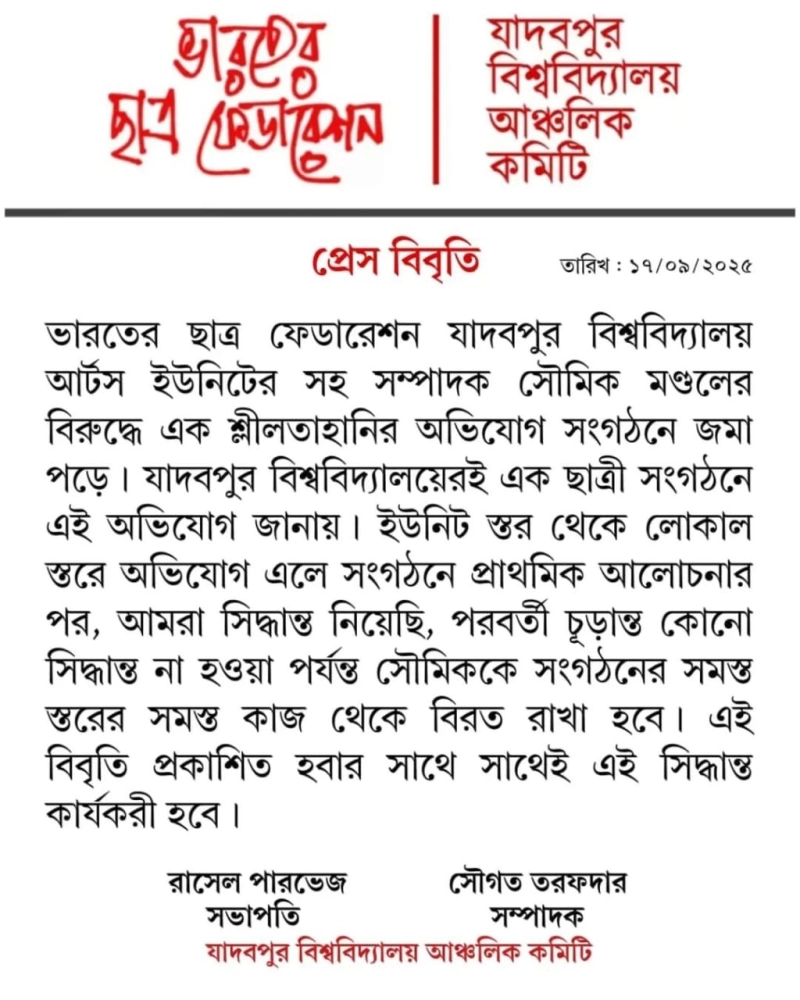 সংগঠনের তরফে বুধবার জারি করা এক প্রেস বিবৃতিতে জানানো হয়েছে, অভিযোগ পাওয়ার পর স্থানীয় স্তরে প্রাথমিক আলোচনা সেরে বিষয়টি আঞ্চলিক কমিটির কাছে পাঠানো হয়। প্রাথমিক তদন্তে অভিযোগের যথেষ্ট ভিত্তি পাওয়া গিয়েছে বলে মনে করছে সংগঠন। তাই চূড়ান্ত সিদ্ধান্ত না-হওয়া পর্যন্ত সৌমিক মণ্ডলকে সমস্ত সাংগঠনিক কাজ থেকে সাসপেন্ড রাখা হবে। বিবৃতিতে আঞ্চলিক কমিটির সভাপতি রাসেল পারভেজ এবং সম্পাদক সৌগত তরফদার স্বাক্ষর করেছেন।