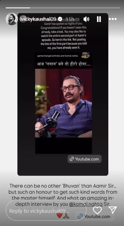 এক অনুষ্ঠানে আমির খোলাখুলি বলেন— “ভিকি কৌশলের মধ্যে ভুবনের গুণগুলো স্বাভাবিকভাবেই আছে—মর্যাদা, শক্তি, ভেতরের স্থিরতা আর সততা। ও দারুণ অভিনেতা।”এই প্রশংসার জবাবে ভিকি কৌশলও নিজের আবেগ লুকোলেন না। ইনস্টাগ্রাম স্টোরিতে তিনি সেই মুহূর্তের ছবি পোস্ট করে লিখলেন— “ভুবন মানেই আমির স্যার… তিনি ছাড়া ওই চরিত্রে আর কাউকে মানায় ন! তবে তাঁর কাছ থেকে এমন কথা পাওয়া সত্যিই গর্বের।”
