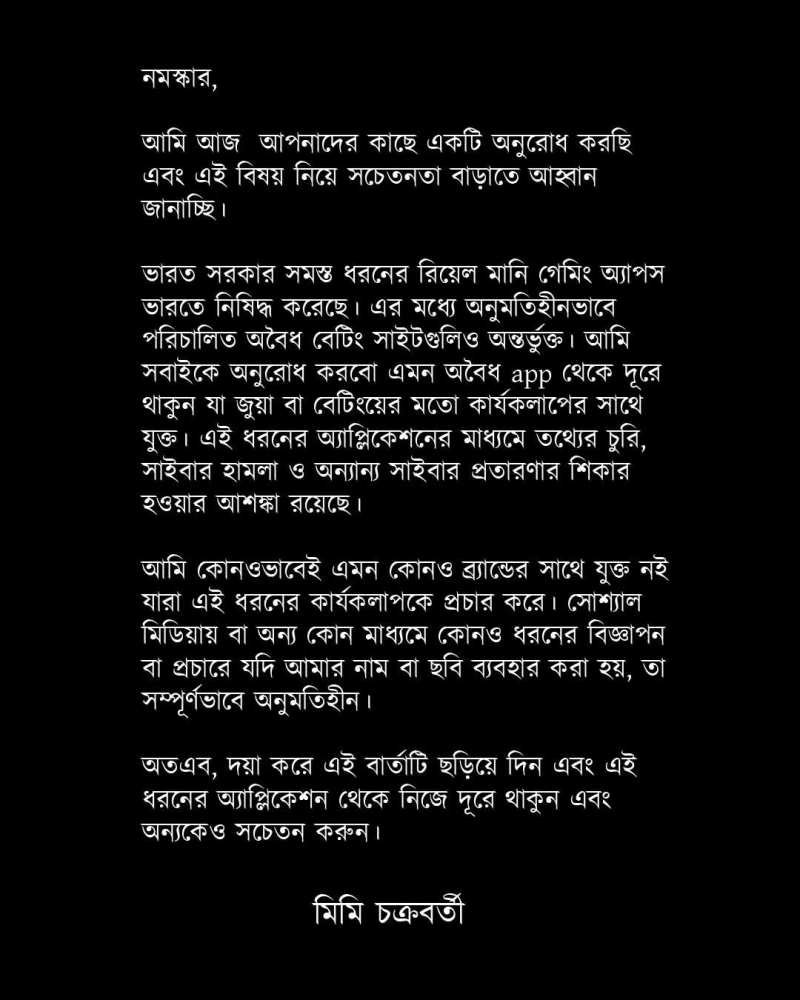 নোটিশে মিমি লেখেন, 'আমি আজ আপনাদের কাছে একটি অনুরোধ করছি এবং এই বিষয় নিয়ে সচেতনতা বাড়াতে আহ্বান জানাচ্ছি। ভারত সরকার সমস্ত ধরনের রিয়েল মানি গেমিং অ্যাপস ভারতে নিষিদ্ধ করেছে। এর মধ্যে অনুমতিহীনভাবে পরিচালিত অবৈধ বেটিং সাইটগুলিও অন্তর্ভুক্ত। আমি সবাইকে অনুরোধ করব এমন অবৈধ অ্যাপ থেকে দূরে থাকুন যা জুয়া বা বেটিংয়ের মতো কার্যকলাপের সাথে যুক্ত। এই ধরনের অ্যাপ্লিকেশনের মাধ্যমে তথ্যের চুরি, সাইবার হামলা ও অন্যান্য সাইবার প্রতারণার শিকার হওয়ার আশঙ্কা রয়েছে।'