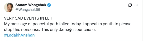 তাঁর সমর্থকদের উদ্দেশে ওয়াংচুক শান্ত থাকার আহ্বান জানিয়ে বলেছেন, “আমি যুবকদের অগ্নিসংযোগ ও সংঘর্ষ বন্ধ করার জন্য অনুরোধ করছি। আমরা আমাদের অনশন শেষ করছি এবং আমি প্রশাসনকে কাঁদানে গ্যাস ব্যবহার বন্ধ করার জন্য অনুরোধ করছি। হিংসায় প্রাণহানি হলে কোনও অনশন সফল হয় না।” লাদাখের ঘটনাবলীর সর্বশেষ মোড় নিয়ে উদ্বেগ প্রকাশ করে ওয়াংচুক বলেন যে তাঁর শান্তির বার্তা ব্যর্থ হয়েছে।