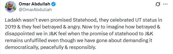 জম্মু ও কাশ্মীরের মুখ্যমন্ত্রী ওমর আবদুল্লাহ এক্স হ্যান্ডলে লিখেছেন, “লাদাখকে রাজ্যের মর্যাদা দেওয়ার প্রতিশ্রুতিও দেওয়া হয়নি, তারা ২০১৯ সালে কেন্দ্রশাসিত অঞ্চল হওয়ার খুশি উদযাপন করেছে। তারা এখন বিশ্বাসঘাতকতা ও ক্ষুব্ধ বোধ করছে। এখন কল্পনা করার চেষ্টা করুন যে জম্মু ও কাশ্মীরকে রাজ্যের মর্যাদা দেওয়ার প্রতিশ্রুতি যখন অপূর্ণ থাকে, তখন আমরা কতটা বিশ্বাসঘাতকতা ও হতাশ বোধ করি, যদিও আমরা গণতান্ত্রিকভাবে, শান্তিপূর্ণভাবে এবং দায়িত্বশীলভাবে এটি দাবি করে আসছি।”