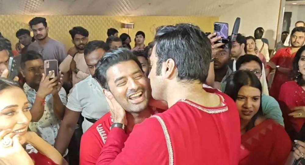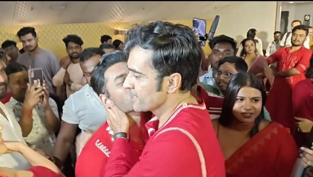 এদিন অঙ্কুশের আগেই হাজির হয়েছিলেন আবির। বড়পর্দায় ছবির কিছু অংশ দেখে বেরোতেই দেখা হয় অঙ্কুশের সঙ্গে। তাঁকে দেখেই জড়িয়ে ধরেন, গালে চুমু এঁকে দেন। এদিকে অঙ্কুশও কম যান না, তিনিও আবিরে জড়িয়ে যেন আহ্লাদে আটখানা। আর ঠিক এই সময় প্রিমিয়ারে ঢোকেন মিমি চক্রবর্তী।