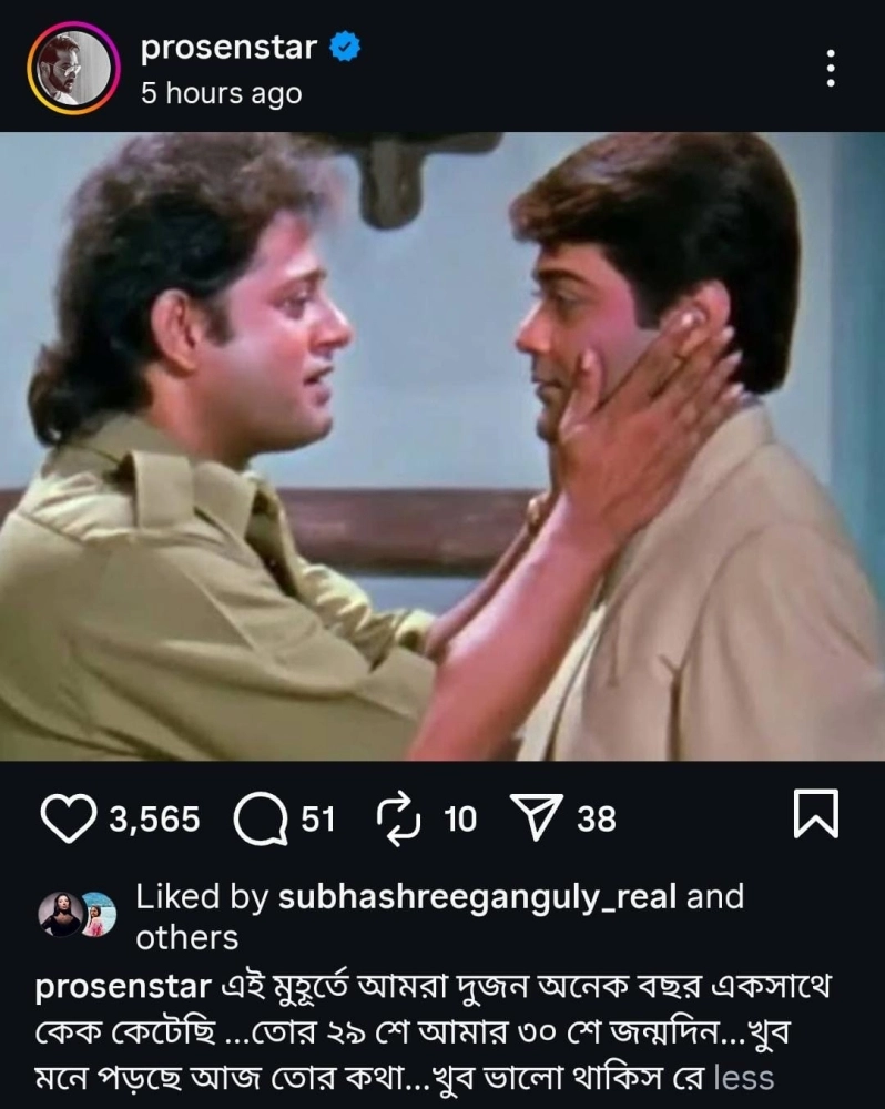 প্রয়াত জনপ্রিয় অভিনেতা-রাজনীতিবিদ তাপস পালের দারুণ সম্পর্ক ছিল প্রসেনজিতের। গতকাল অর্থাৎ ২৯ সেপ্টেম্বর ছিল তাপস পালের জন্মবার্ষিকী। ইন্ডাস্ট্রির অন্দরে কান পাতলে শোনা যেত, ২ জনের মধ্যে নাকি রেশারেশি রয়েছে। তবে খুব ঘনিষ্ঠদের সঙ্গে কথা বললে জানা যায়, সম্পর্কের সমীকরণ ছিল একেবারেই আলাদা। দুই নায়ক একে অপরকে ভীষণ স্নেহ করতেন। জন্মদিনে করা সেই পোস্টে যেন ফুটে উঠল সেই সম্পর্কের রসায়নের ঝলক। তাপস পাল নেই। আর তাঁর স্মৃতিতেই একটি পুরনো ছবি ভাগ করে নিলেন প্রসেনজিৎ চট্টোপাধ্যায়। ছবিটা একটি সিনেমার দৃশ্য। তাপস পাল, দুই হাতে ধরে রয়েছেন প্রসেনজিতের মুখ। ছবিটি শেয়ার করে প্রসেনজিৎ লিখেছেন, 'এই মুহূর্তে আমরা দুজন অনেক বছর একসঙ্গে কেক কেটেছি ...তোর ২৯ শে আমার ৩০ শে জন্মদিন...খুব মনে পড়ছে আজ তোর কথা...খুব ভাল থাকিস রে'। ১২টা বাজার সামান্য আগেই এই পোস্টটি করেছেন তিনি। অর্থাৎ, কখনও একসঙ্গে সেটে কাজ করতে করতে এই দিনটা এলে, তাঁরা ২ জনে এক কেক কেটে উদযাপন করতেন জন্মদিন।