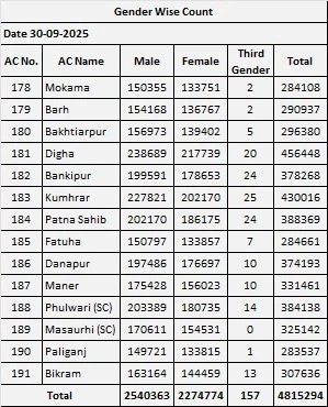 আজকাল ওয়েবডেস্ক: বিশেষ নিবিড় সংশোধন (SIR) সম্পন্ন হওয়ার পর মঙ্গলবার ভারতের নির্বাচন কমিশন (ইসিআই) বিহার বিধানসভা নির্বাচনের জন্য চূড়ান্ত ভোটার তালিকা প্রকাশ করেছে। চূড়ান্ত ভোটার তালিকায় খসড়া তালিকার তুলনায় নিবন্ধিত ভোটারের সংখ্যা বৃদ্ধি পেয়েছে। পরিসংখ্যান অনুসারে, পাটনা জেলায় মোট ভোটারের সংখ্যা এখন ৪৮,১৫,২৯৪ জন। ১ আগস্ট, ২০২৫ তারিখে জারি করা খসড়া ভোটার তালিকায় ৪৬,৫১,৬৯৪ জন ভোটার রেকর্ড করা হয়েছে। এক মাসব্যাপী দাবি এবং আপত্তি প্রক্রিয়ার পর, পাটনা জেলায় চূড়ান্ত তালিকায় ১,৬৩,৬০০ জন ভোটার বৃদ্ধি পেয়েছে।