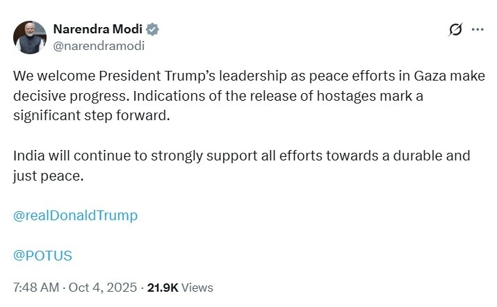 মোদি প্রকাশ্যে ধন্যবাদ জানিয়ে ভারত-মার্কিন অংশীদারিত্ব আরও জোরদার করার প্রতিশ্রুতি দেন। অক্টোবরের শুরুতে প্রেসিডেন্ট ট্রাম্প ট্রুথ সোশ্যালে মোদির একটি বার্তা পুনরায় শেয়ার করেন, যেখানে মোদি ট্রাম্পের গাজা শান্তি পরিকল্পনাকে দীর্ঘমেয়াদি শান্তির একটি কার্যকর পথ বলে সমর্থন জানিয়েছিলেন। ট্রাম্প অতিরিক্ত মন্তব্য না করলেও এই পদক্ষেপটিকে ইতিবাচক কূটনৈতিক ইঙ্গিত হিসেবে দেখা হচ্ছে।