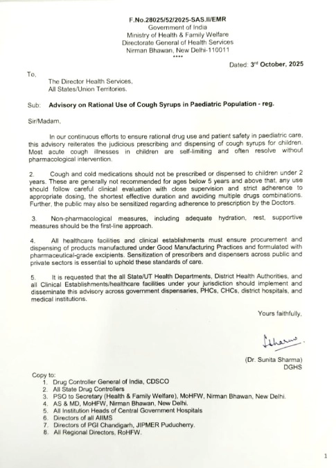 উল্লেখযোগ্য বিষয়, মধ্যপ্রদেশ এবং রাজস্থানে ১১ জন শিশুর কাশির সিরাপ খাওয়ার কারণে মৃত্যুর অভিযোগ উঠেছে। গোটা বিষয়টি নিয়ে তোলপাড় দেশ। এর পরেই স্বাস্থ্য মন্ত্রক নড়েচড়ে বসে এবং জারি করা হয় নির্দেশিকা।