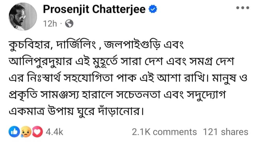 সমাজমাধ্যমে তারকা অভিনেতা লিখেছেন, “কুচবিহার, দার্জিলিং, জলপাইগুড়ি এবং আলিপুরদুয়ার এই মুহূর্তে সারা দেশ এবং সমগ্র দেশ এর নিঃস্বার্থ সহযোগিতা পাক এই আশা রাখি। মানুষ ও প্রকৃতি সামঞ্জস্য হারালে সচেতনতা এবং সদুদ্যোগ একমাত্র উপায় ঘুরে দাঁড়ানোর।”