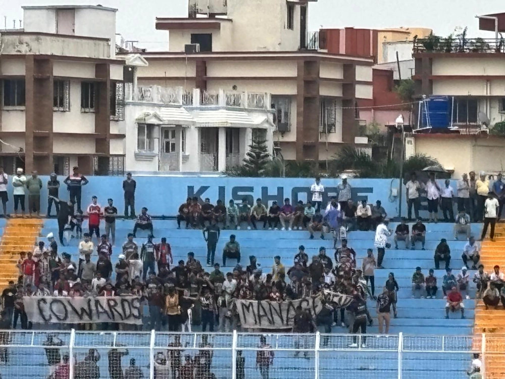 সম্পূর্ণা চক্রবর্তী: কিশোর ভারতীতে রবসন ম্যাজিক। কিন্তু শিল্ডের প্রথম ম্যাচে ৫-১ গোলে জয়ও থামাতে পারল না গো ব্যাক স্লোগানে। গ্যালারিতে চোখে পড়ল 'কাওয়ার্ড ম্যানেজমেন্ট' পোস্টার। বৃহস্পতিবার দুপুর থেকেই তুমুল বৃষ্টি। তখনও ম্যাচ শুরু হতে বেশ কিছুক্ষণ বাকি। এএফসি চ্যাম্পিয়ন্স লিগের ম্যাচ খেলতে ইরানে না যাওয়ার প্রতিবাদে শিল্ডের প্রথম ম্যাচ বয়কট করে মোহনবাগান সমর্থকরা। তারমধ্যে খুব বেশি হলে ৮০০ থেকে ১০০০ সমর্থক হাজির কিশোর ভারতী স্টেডিয়ামে। শুরুতে সেই সংখ্যা ছিল দুশো মতো। তবে ম্যাচের বয়স বাড়ার সঙ্গে কিছুটা বাড়ে সমর্থকের সংখ্যা। দুটো টিফো নিয়ে হাজির ছিল বাগান সমর্থকরা। তারমধ্যে সমর্থকদের থেকে 'শেম শেম' টিফো কেড়ে নেয় পুলিশ।