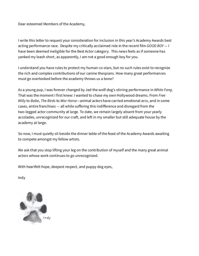 চিঠিতে ইন্ডি লিখেছে, “আমার সাম্প্রতিক ছবি ‘গুড বয়’-এর সমালোচক প্রশংসিত ভূমিকার পরও আমাকে ‘সেরা অভিনেতা’র বিভাগে বিবেচনা করা হল না। মনে হয় আমি আপনাদের কাছে যথেষ্ট ভাল ছেলে নই।” ইন্ডি আরও উল্লেখ করেছে, মানব হৃদয় ছুঁয়ে যাওয়া অসংখ্য প্রাণী অভিনয়ের উদাহরণ—ফ্রম হোয়াইট ফ্যাং-এর জেড দ্য উলফ-ডগ, ফ্রি উইলি-এর হোয়েল, এবং বেব-এর সেই চটপটে শূকর, যারা কখনও অস্কারের সোনালী মূর্তি পায়নি।