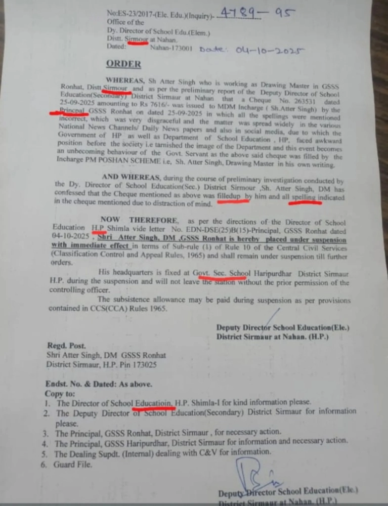 সিরমৌরের স্কুল শিক্ষা (প্রাথমিক) বিভাগের উপ-পরিচালক রাজীব ঠাকুর, যিনি স্থগিতাদেশের আদেশ জারি করেছিলেন, তিনি বলেন, “বানান ভুল সাধারণত উপেক্ষা করা হয় এবং অপরাধীকে সতর্ক করে ছেড়ে দেওয়া হয়। কিন্তু এই ক্ষেত্রে, শব্দ পরিবর্তন করা হয়েছে। থাউজ্যান্ডকে থার্সডে এবং হান্ড্রেডকে হরেন্দ্র লেখা হয়েছে। তাই, এই পদক্ষেপ।”