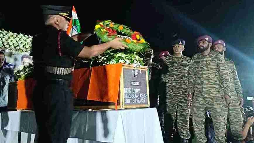 এদিন সকাল থেকেই বীরভূমের রাজনগর ব্লকের কুন্ডিরা গ্রাম যেন স্তব্ধ। সেনাবাহিনীর কনভয়ে কফিনবন্দি অবস্থায় ফিরে আসে দেশের শহিদ সন্তান—প্যারা কমান্ডো সুজয় ঘোষ। তাঁর দেহ আসতেই ভেঙে পড়ে গোটা গ্রাম। শোক আর কান্নায় ভরে ওঠে চারদিক। প্রিয়জন, প্রতিবেশী, সহপাঠী—সবাই ছুটে আসেন শেষবারের মতো তাঁকে দেখতে। শ্রদ্ধা জানাতে হাজির হন বীরভূমের জেলাশাসক বিধান রায়, জেলা পরিষদের সভাধিপতি কাজল শেখ, সিউড়ির বিধায়ক বিকাশ রায়চৌধুরী বিজেপির বীরভূম সাংগঠনিক জেলার সভাপতি ধ্রুব সাহা-সহ বিভিন্ন রাজনৈতিক দলের নেতৃত্ব। সেনাবাহিনীর মর্যাদাপূর্ণ প্রহরায় শেষ শ্রদ্ধা জানানো হয় এই বীরযোদ্ধাকে। বক্রেশ্বর শ্মশানে সম্পন্ন হয় তাঁর শেষকৃত্য, পূর্ণ রাষ্ট্রীয় মর্যাদায়।