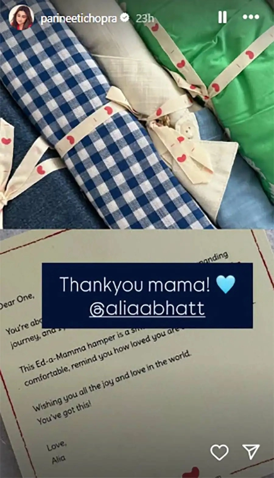মা হতে চলেছেন পারিণীতি চোপড়া। এমন এক সময়ে সহ-অভিনেত্রী আলিয়া ভাট পাঠালেন এক মিষ্টি উপহার, যা পেয়ে উচ্ছ্বসিত হতে বাধ্য ‘ইশকজাদে’ অভিনেত্রী। শিশুদের জন্য আলিয়ার ব্র্যান্ড ‘এড-আ-মামা’ থেকে পাঠানো একটি বিশেষ গিফট হ্যাম্পার পেলেন পারিণীতি, যা তিনি শেয়ারও করেছেন নিজের ইনস্টাগ্রাম স্টোরিতে। সেখানে লিখেছেন, “ধন্যবাদ!” একরাশ ভালবাসা আর কৃতজ্ঞতা ঝরে পড়েছে সেই সংক্ষিপ্ত বার্তায়।