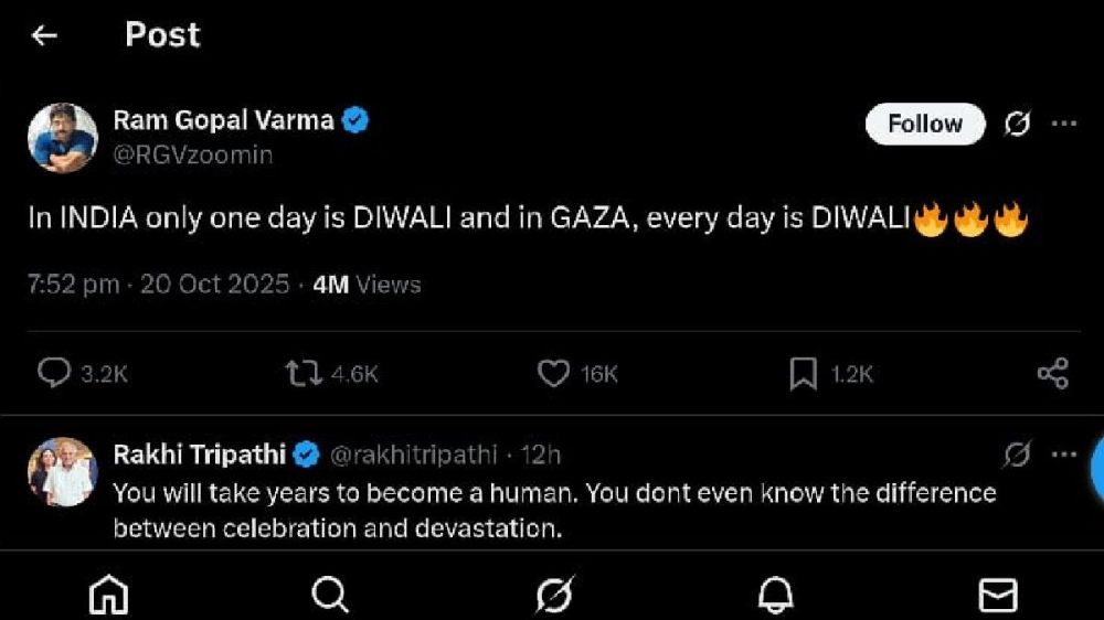 সোমবার সন্ধেবেলা, যখন গোটা দেশ বাজি পুড়িয়ে, আলো জ্বালিয়ে দীপাবলির উদযাপনে মগ্ন, ঠিক সেই সময়েই বিতর্কিত পোস্টটি করেন ‘রঙ্গিলা’-খ্যাত পরিচালক। লেখেন, ‘ভারতে শুধু একদিন দীপাবলি হচ্ছে, আর গাজায় প্রত্যেক দিন দীপাবলি হচ্ছে।” অর্থাৎ গাজায় ইজরায়েলি বোমাবর্ষণের আগুনের সঙ্গে দীপাবলির আলোর তুলনা করেন ‘রামু’। এই পোস্ট প্রকাশ্যে আসতেই ক্ষোভে ফেটে পড়েন নেটিজেনরা। তাঁদের মতে, যেখানে গাজায় প্রতিদিন নিরীহ মানুষের মৃত্যু হচ্ছে, শিশুরা মারা যাচ্ছে, সেই ভয়ঙ্কর মানবিক বিপর্যয়ের সঙ্গে একটি ধর্মীয় উৎসবের তুলনা টানা শুধু কুরুচিকরই নয়, অমানবিকও বটে।
