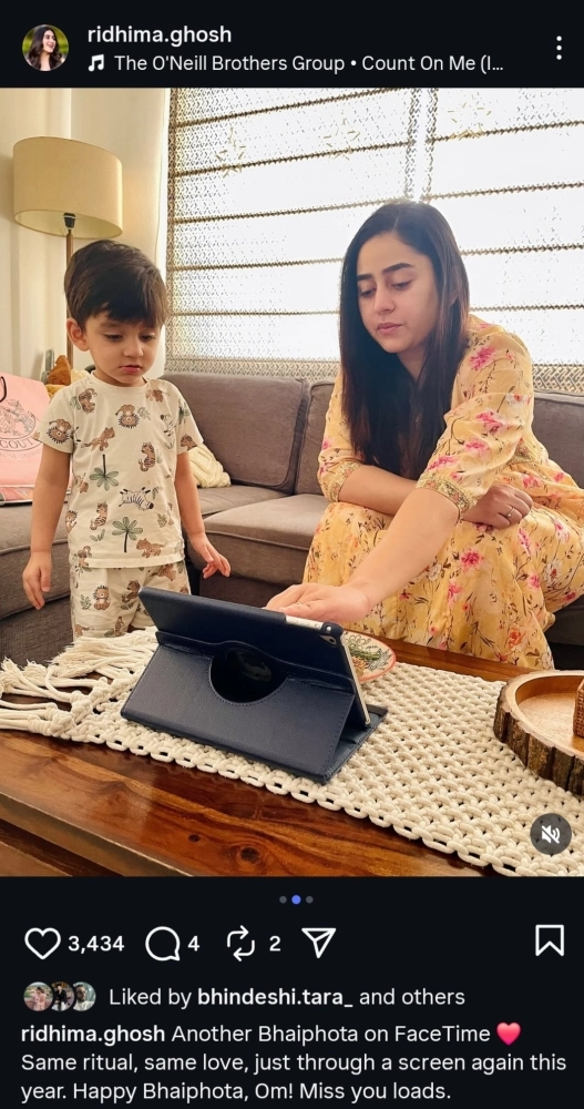ভাই দূরে থাকায় এ বছরও ভার্চুয়ালি ভাইফোঁটার আয়োজন করেছেন অভিনেত্রী ঋদ্ধিমা ঘোষ। ভিডিও কলেই ভাইয়ের কপালে ফোঁটা দিয়েছেন তিনি। সেই ছবি সমাজমাধ্যমে ভাগ করে তিনি লিখেছেন, 'ফেস টাইমেই আরও একটা ভাইফোঁটা কাটছে। সেই একই নিয়ম, একই ভালবাসা তবে এবারও ভার্চুয়ালি। শুভ ভাইফোঁটা, খুব মিস করছি তোকে।'